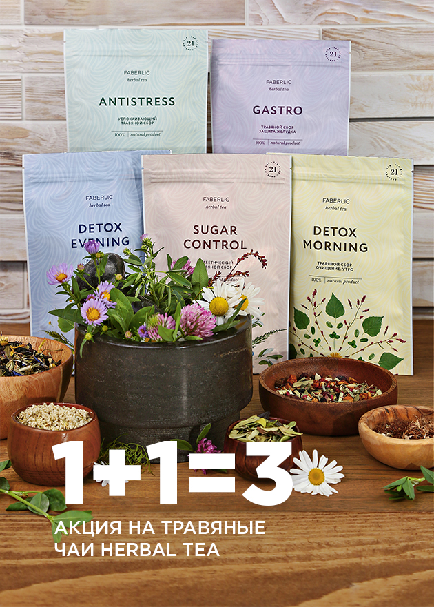 Сама природа подсказала нам вкусные и полезные рецепты – для здоровья тела и гармонии души. Начните новый год с укрепления иммунитета и общего здоровья! Чрезвычайно полезная суперакция на травяные сборы Herbal Tea FABERLIC: 1+1=3!